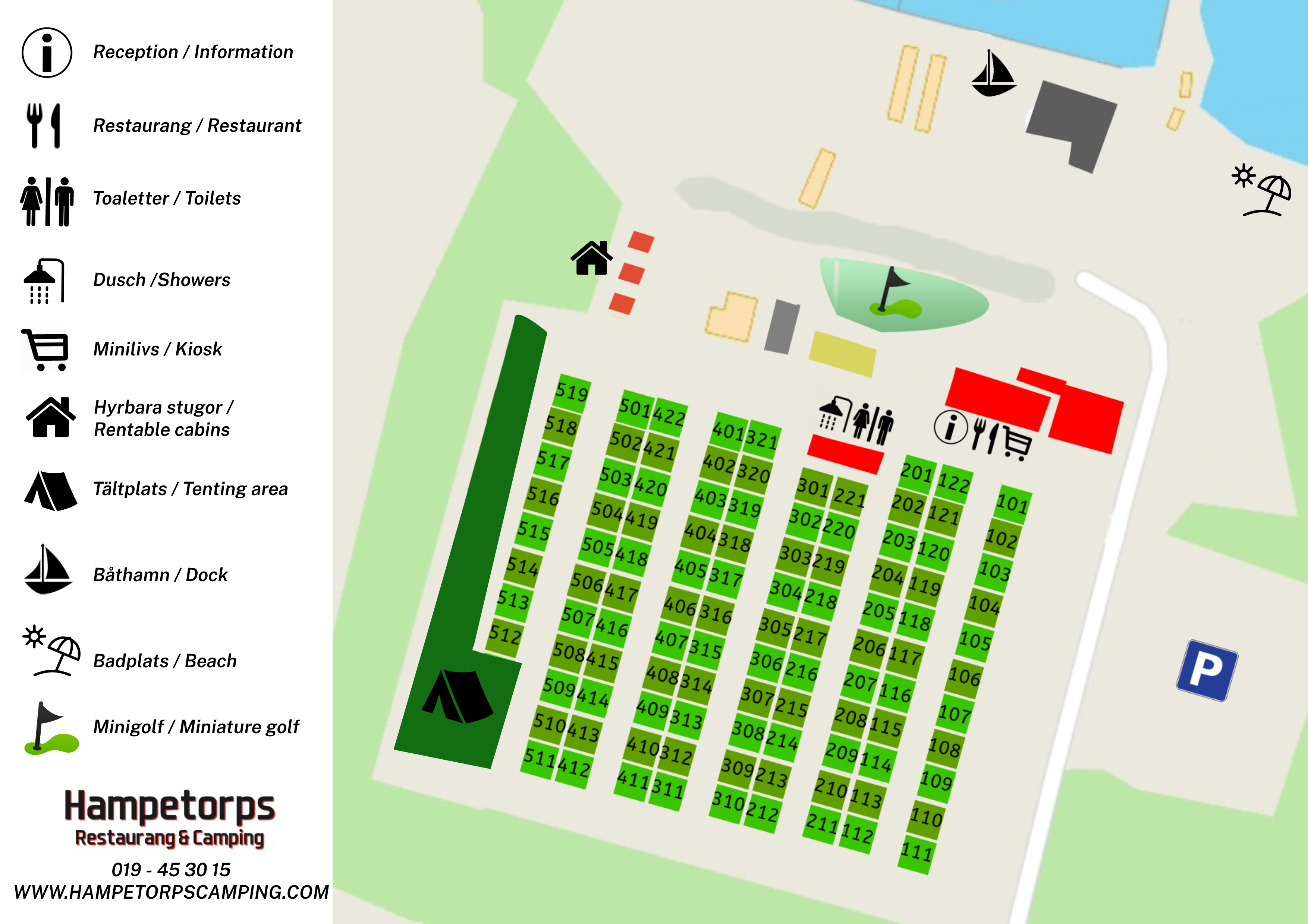 En liten karta över Campingen för att bilda uppfattning vart campingrutorna ligger i förhållande till övriga delar av campingen.